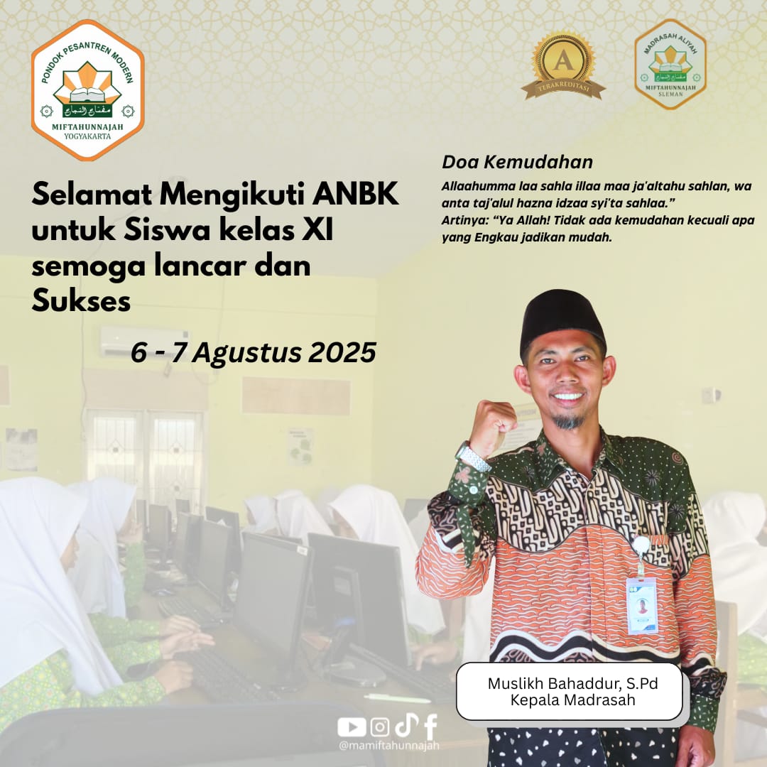 Pelaksanaan ANBK di MA Miftahunnajah Sleman didukung oleh panitia internal yang telah dipersiapkan jauh-jauh hari. Kepala madrasah, Bapak/Ibu [nama kepala madrasah], menyampaikan rasa syukur atas kelancaran kegiatan ini.