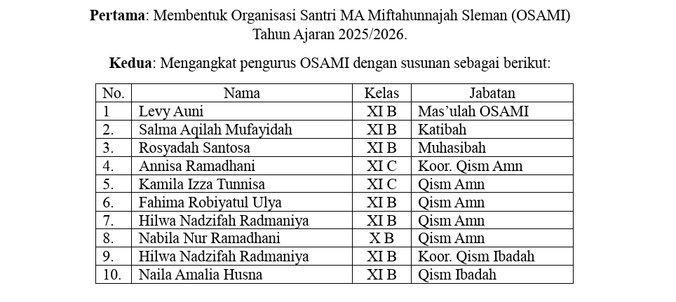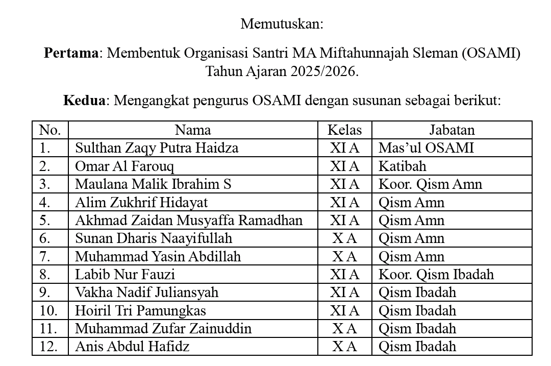 Melalui pelantikan Pengurus OSAMI ini, MA Miftahunnajah Sleman menegaskan komitmennya dalam memperkuat tata kelola organisasi santri, menata kehidupan asrama secara lebih profesional, serta menyiapkan generasi santri yang tidak hanya unggul dalam akademik dan religiusitas, tetapi juga matang dalam kepemimpinan dan pengabdian.