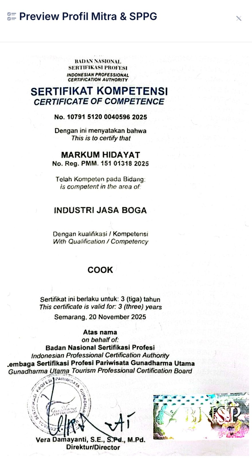 Kepemilikan Sertifikat Laik Higiene Sanitasi (SLHS) menjadi bukti bahwa proses pengolahan makanan telah memenuhi standar kebersihan dan keamanan pangan. Sementara itu, sertifikasi halal memberikan jaminan bahwa makanan yang disajikan sesuai dengan prinsip kehalalan. Dukungan dari chef andal bersertifikat semakin memperkuat kualitas sajian, baik dari segi rasa, gizi, maupun penyajian.