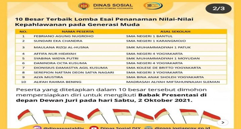 Lomba diadakan oleh DInas Sosial Daerah Istimewa Yogyakarta dengan mengambil tema “Penanaman Nilai-nilai Kepahlawanan pada Generasi Muda. Lomba ini diadakan pada tanggal 20-21 September dan tahap selanjutnya pada tanggal 2 Oktober.